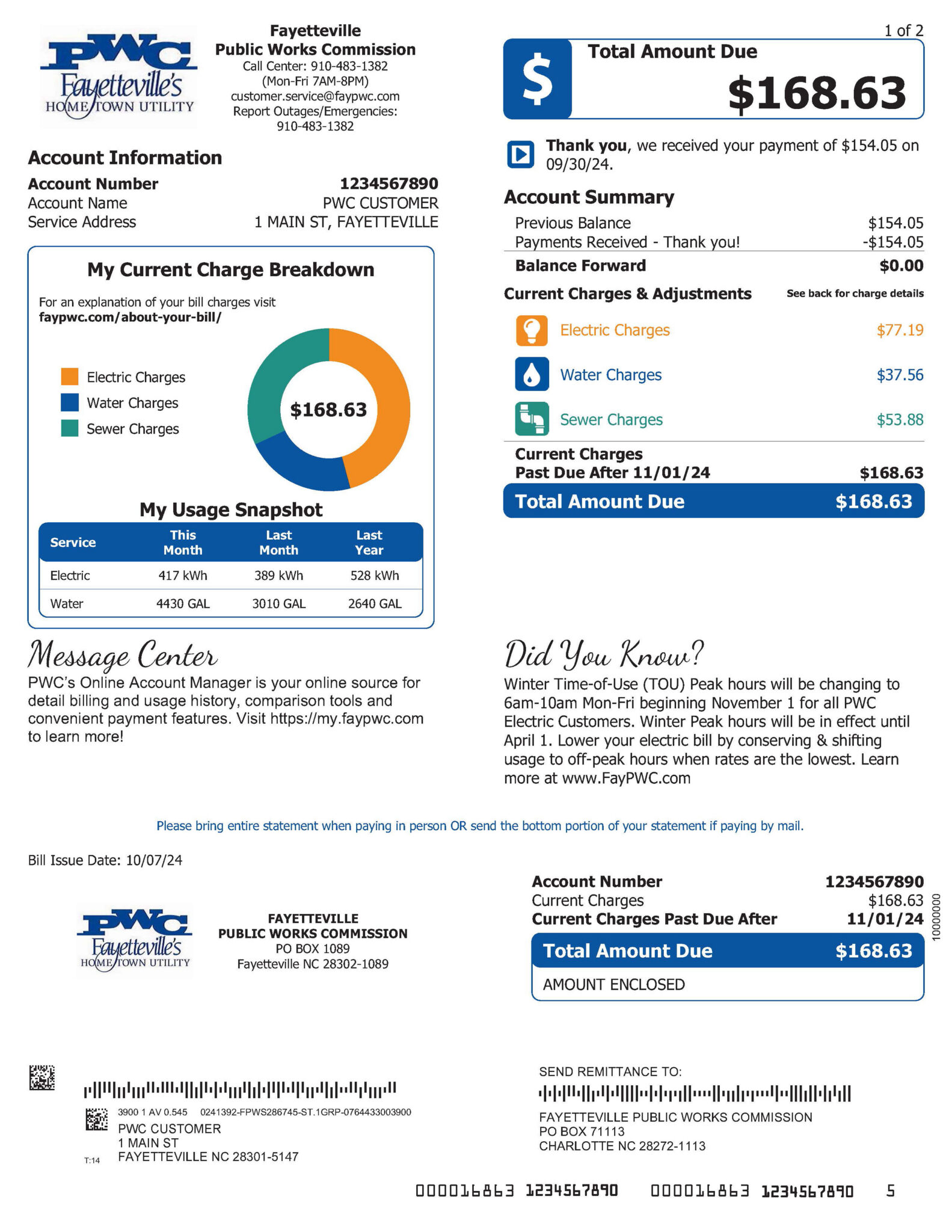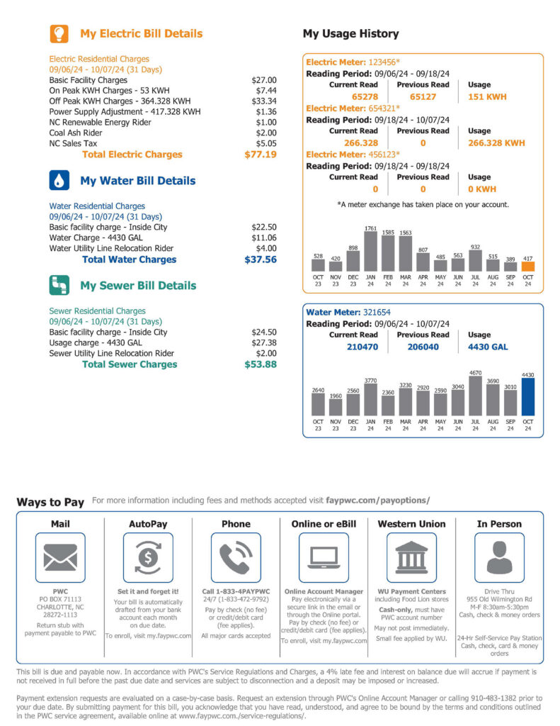 PWC provides a monthly bill that provides detailed information on your utility services. Below is an image of a sample bill.